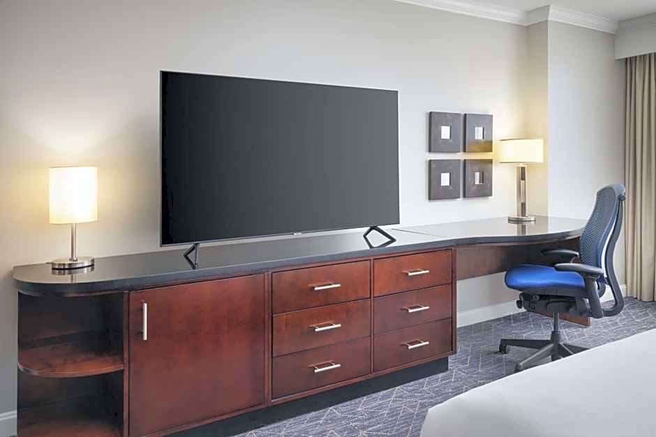 Any corresponding photo may not reflect the specific accessible room type or room feature. This mobility and hearing accessible executive level room features one king bed, and an accessible tub. The room also has a visual alarm, and notification devices for the doorbell or door knock and incoming telephone calls. Before retiring to your room, relax in our Executive Concierge Lounge where you will find snacks and beverages. Our refined King Rooms feature a Hilton Suite Dreams king bed prepared with the Hilton Serenity Collection, our luxurious custom designed bedding. High-speed internet access is standard in all guest rooms, providing a quick, easy connection to the online world. Enjoy your favorite television show on your 42" LCD TV or unwind to your personal selection of songs on our specially designed MP3 alarm clock radio, which allows guests to connect their own portable music player. Each guestroom offers a coffee maker, work desk, ergonomic desk chair, iron/ironing board.